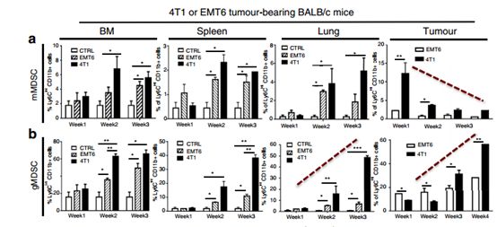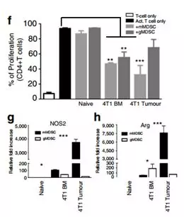 MDSCs是具有两个主要亚群的不成熟的髓细胞群体,mMDSC和gMDSC。然而,这些肿瘤中MDSC亚群的身份及其与肿瘤相互作用的分子机制仍然难以捉摸。研究人员在EMT6或4T1肿瘤植入后1-4周研究了在原发性肿瘤,骨髓,脾和肺中的mMDSC和gMDSC的系统性诱导和浸润。结果证明在4T1肿瘤中检测到早期浸润(早至1周)的原发性肿瘤中的mMDSCs,并在第4周时逐渐增加gMDSC(图2a,b)。虽然与携带4T1肿瘤的小鼠的原发性肿瘤浸润相比,肺部mMDSC浸润较低,但在检测肺部转移性病变之前,第3周肺部gMDSC浸润增加了410倍(图2a,b)(图1b )。肿瘤衍生的mMDSCs在体外表现出较高水平的T细胞抑制,这可能是由于较高水平的一氧化氮合酶(NOS2)和精氨酸酶1(ARG1;图2g,h)造成的。这些发现表明,mMDSCs和gMDSCs分别在原发肿瘤和肺中浸润,除了抑制抗肿瘤免疫应答外,还能促进转移。