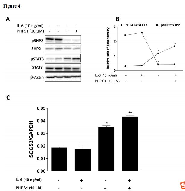 为了测试去活化的SHP2是否干扰STAT3活化,我们使用PHPS1特异性药理学抑制剂来靶向来自严重哮喘患者的成纤维细胞中的SHP2活性。与载体处理相比,用PHPS1处理的成纤维细胞显示SHP2磷酸化降低80%(图4-A)。 SHP2的抑制也导致STAT3磷酸化的显着恢复(图4-A-B)。由于SOCS蛋白,特别是SOSC3成员,在STAT3激活后迅速诱导,在IL-6刺激后使用qRT-PCR测定SOCS3基因表达。在来自严重哮喘的成纤维细胞中未观察到IL-6刺激对SOCS3基因表达的影响(图4-C)。然而,用SHP2抑制剂治疗来自严重哮喘患者的成纤维细胞诱导了SOCS3基因表达的显着增加(图4-C)。总之,这些数据表明,在严重哮喘患者的成纤维细胞中激活的SHP2对IL-6诱导的STAT3途径激活发挥负调节作用。